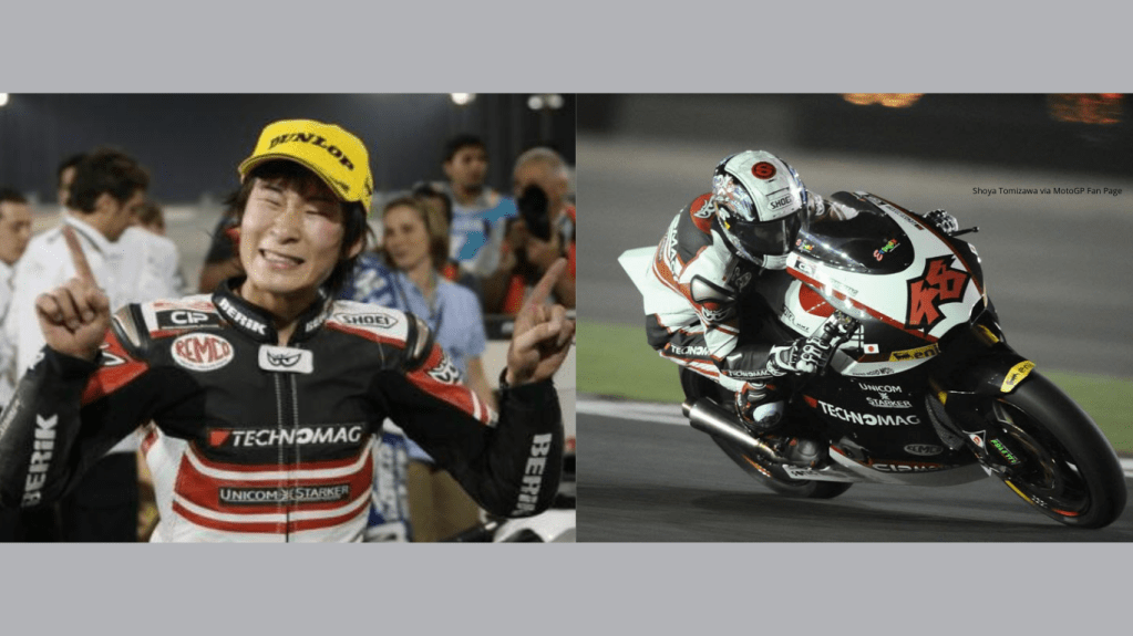 Pembalap asal Jepang yang tewas dalam balapan Grand Prix di sirkuit San Marino, Italia pada tahun 2010. Tomizawa terlibat kecelakaan dengan pembalap lain saat mengikuti balapan Moto2. Ia dinyatakan meninggal dunia pada usia 19 tahun. - Marco Simoncelli